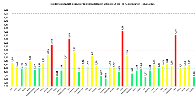 În intervalul 14.01.2021 (10:00) – 15.01.2021 (10:00) au fost raportate 63 de decese (40 bărbați și 23 femei), ale unor pacienți infectați cu noul coronavirus, internați în spitalele din Alba, Brăila, Bistrița-Năsăud, Caraș-Severin, Cluj, Constanța, Dâmbovița, Dolj, Galați, Hunedoara, Ialomița, Iași, Maramureș, Mehedinți, Prahova, Sibiu, Suceava, Teleorman, Timiș, Vaslui, Vrancea și Ilfov.