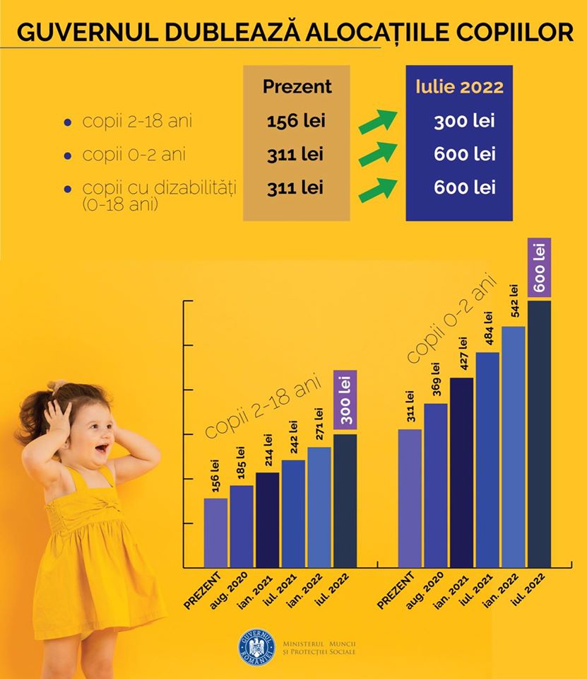 „Astfel, la finalul lui 2022, vom avea o creştere a alocaţiilor de 300 de lei pentru copii între 2 şi 18 ani, respectiv de 600 de lei pentru copii între zero şi 2 ani şi pentru copii cu dizabilităţi între zero şi 18 ani”, a completat ministrul.
