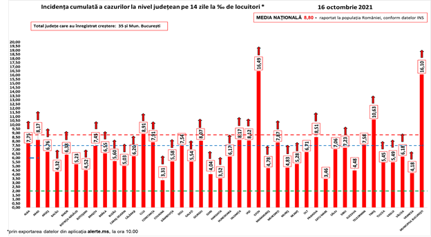 În intervalul 15.10.2021 (10:00) – 16.10.2021 (10:00) au fost raportate de către INSP 352 decese (194 bărbați și 158 femei), dintre care 2 anterioare intervalului de referință, ale unor pacienți infectați cu noul coronavirus, internați în spitalele din Alba, Arad, Argeș, Bacău, Bistrița-Năsăud, Brăila, Botoșani, Brașov, Buzău, Călărași, Caraș-Severin, Cluj, Constanța, Covasna, Dâmbovița, Dolj, Galați, Giurgiu, Gorj, Harghita, Hunedoara, Ilfov, Maramureș, Mehedinți, Mureș, Neamț, Olt, Prahova, Satu Mare, Sălaj, Sibiu, Suceava, Teleorman, Timiș, Tulcea, Vaslui, Vâlcea, Vrancea și Municipiul București.