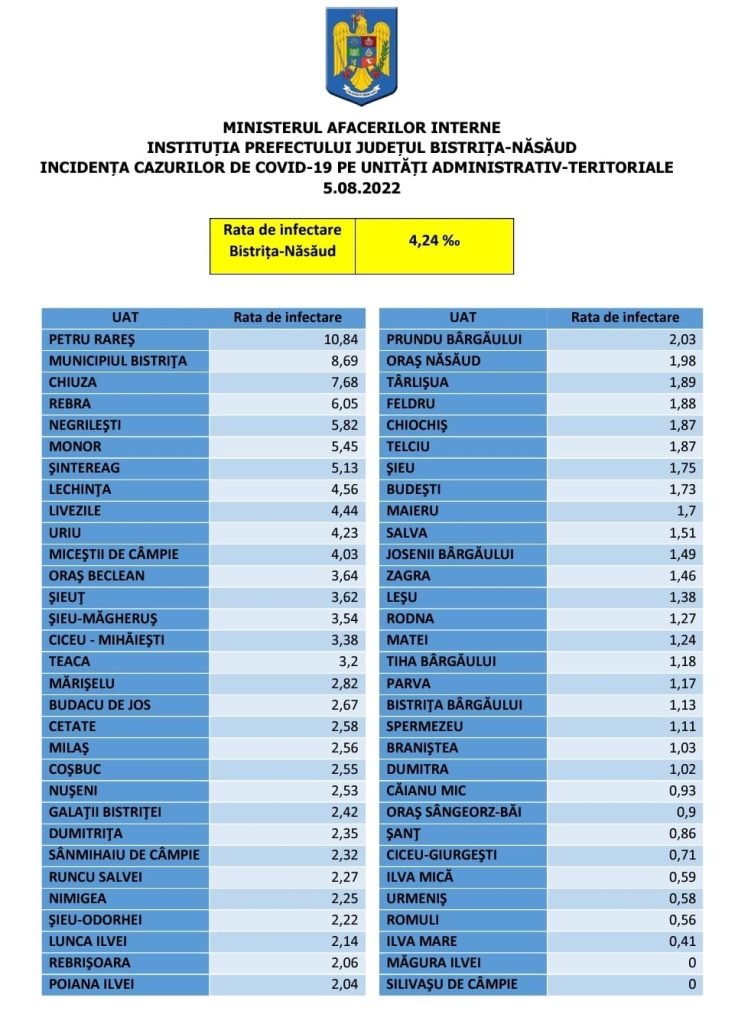 Ministerul Sănătății informează că numărul total al cazurilor de infectare cu virusul SARS-CoV-2 confirmate până astăzi în județul Bistrița-Năsăud este de 32.443, cu 113 mai multe decât ieri, iar cel al deceselor este de 1.115.