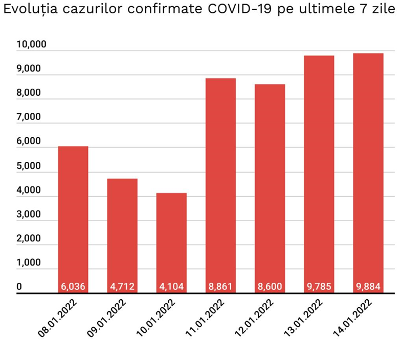 În ultimele 24 de ore au fost înregistrate 9.884 cazuri noi de persoane infectate cu SARS – CoV – 2 (COVID – 19), cu 99 mai mult decât în ziua anterioară. 1.047 dintre cazurile noi din 24 de ore sunt ale unor pacienți reinfectați, testați pozitiv la o perioadă mai mare de 180 de zile după prima infectare.