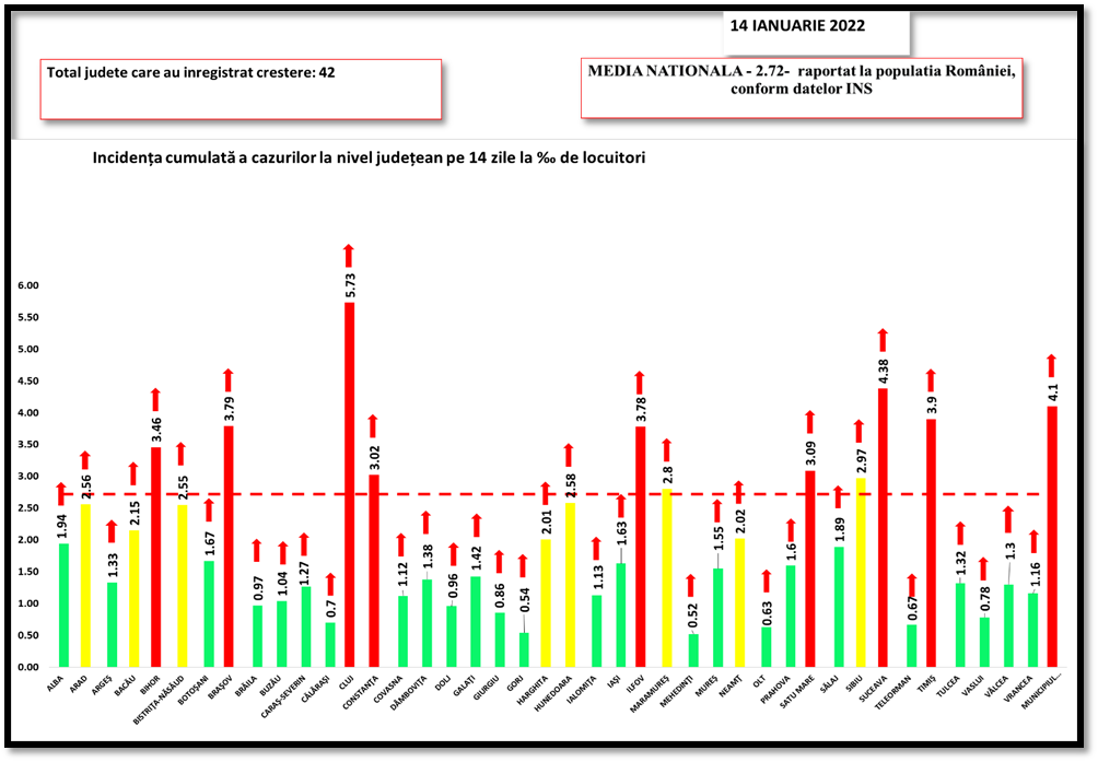 În intervalul 13.01.2022 (10:00) – 14.01.2022 (10:00) au fost raportate de către INSP 30 de decese (17 bărbați și 13 femei), dintre care 3 anterioare intervalului de referință, ale unor pacienți infectați cu noul coronavirus, internați în spitalele din Alba, Arad, Bacău, Botoșani, Brașov, Cluj, Covasna, Dâmbovița, Dolj, Galați, Giurgiu, Harghita, Hunedoara, Iași, Maramureș, Neamț, Sălaj, Suceava, Vrancea.