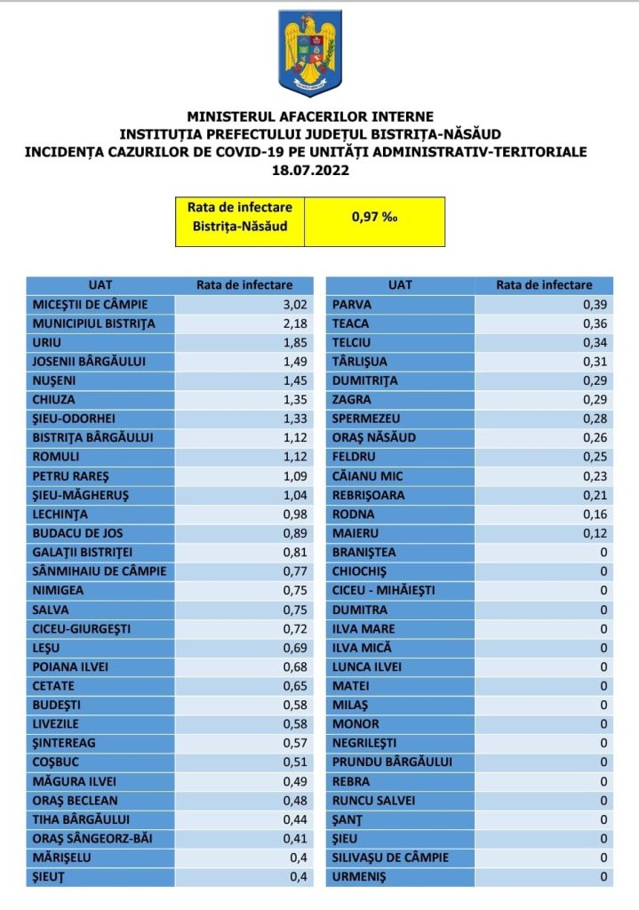 Ministerul Sănătății informează că numărul total al cazurilor de infectare cu virusul SARS-CoV-2 confirmate până astăzi în județul Bistrița-Năsăud este 30.623, cu 19 mai multe decât ieri.