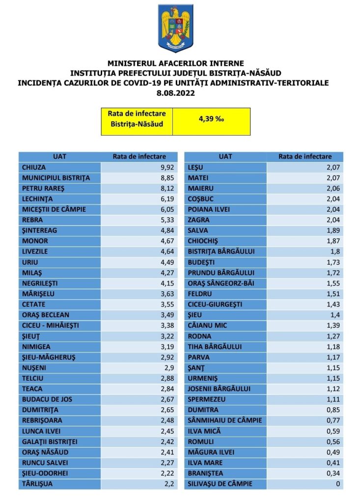 Incidența pe județ este de 4,39 la mia de locuitori, iar în municipiul Bistrița este de 8,85 la mia de locuitori.