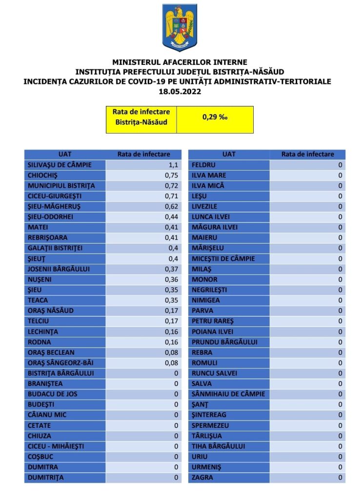 Ministerul Sănătății informează că numărul total al cazurilor de infectare cu virusul SARS-CoV-2 confirmate până astăzi în județul Bistrița-Năsăud este 30.053, cu 4 mai mult decât ieri.