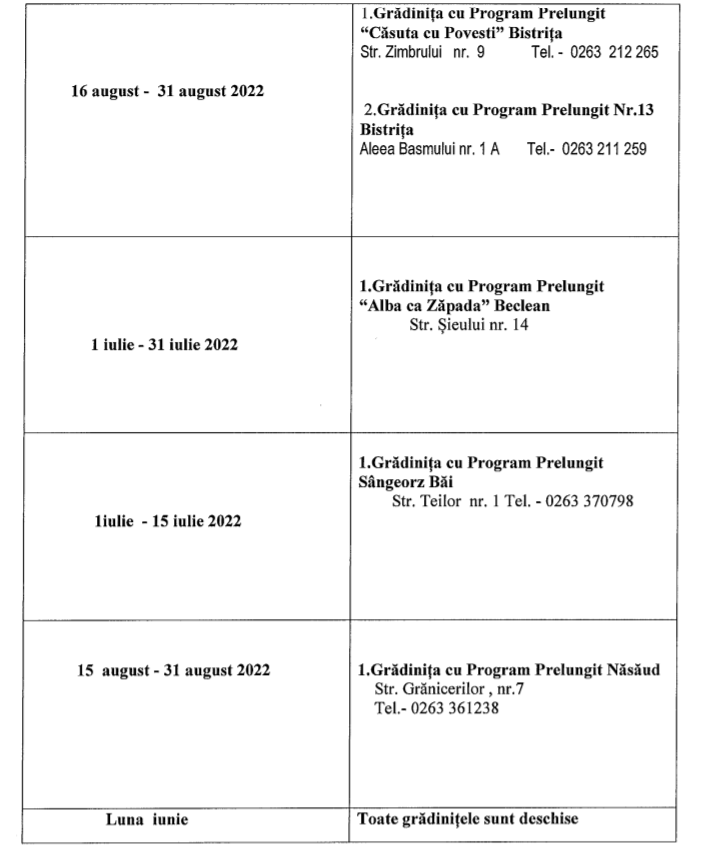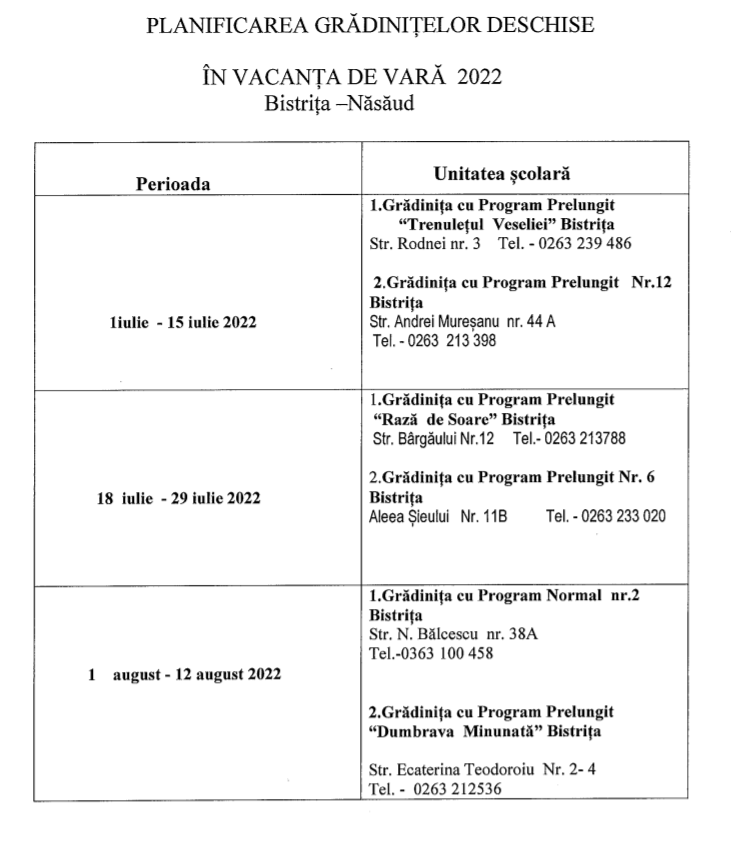 Inspectoratul Școlar Județean Bistrița-Năsăud a realizat o planificare cu privire la grădinițele din mediul urban care vor fi deschide în perioada vacanței de vară. Astfel, vor putea primi copii următoarele grădinițe: