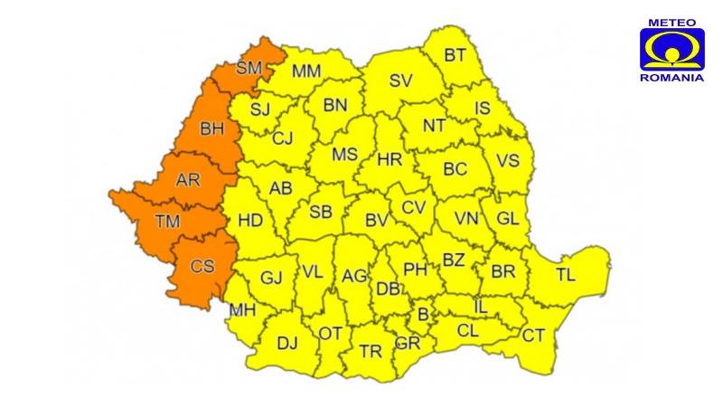 În acelaşi timp, un Cod portocaliu de caniculă şi disconfort termic accentuat se va manifesta miercuri, 23 iunie, în judeţele Caraş-Severin, Timiş, Arad, Bihor şi Satu Mare. Astfel, se vor înregistra temperaturi maxime cuprinse frecvent între 37 şi 39 de grade, iar în cursul nopţii nu vor coborî, în general, sub 22 – 25 de grade.