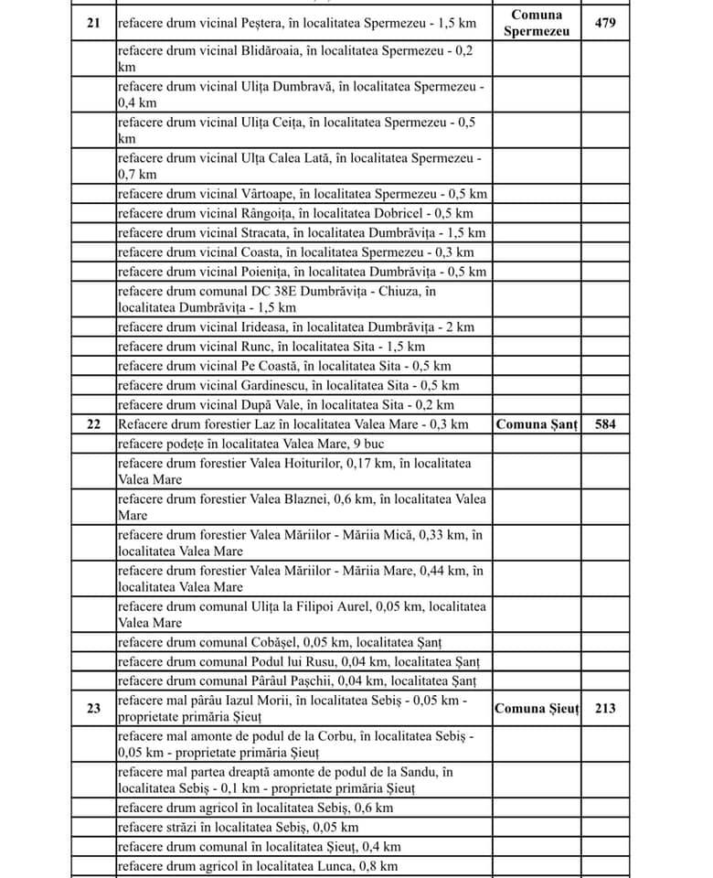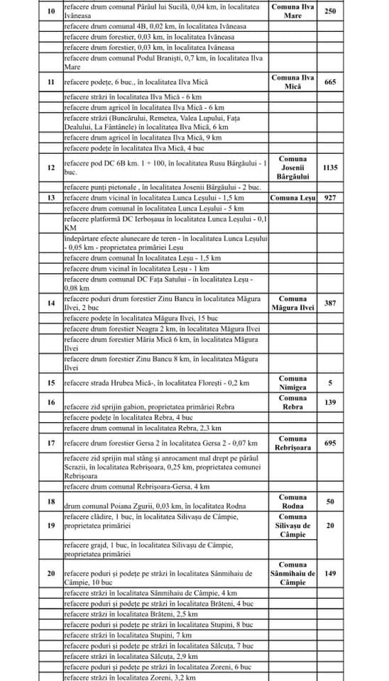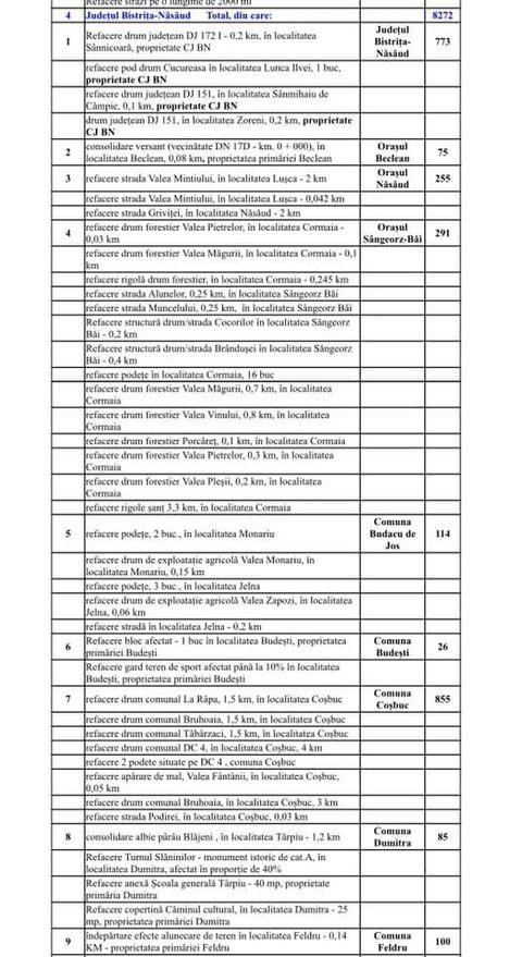 Pe lângă județul Bistrița-Năsăud, au mai primit fonduri încă 23 de județe din țară. Sumele alocate au fost stabilite în baza evaluărilor făcute de către autoritățile administrației publice locale, Inspectoratele pentru Situaţii de Urgenţă şi de către Instituţiile Prefectului pentru cele 24 de județe, unde au avut loc inundaţii, alunecări de teren și unde au fost afectate infrastructura hidrotehnică, terasamentele și malurile de apărare, structura drumurilor județene, a drumurilor comunale, podurilor, podețelor, digurilor și a punților pietonale.