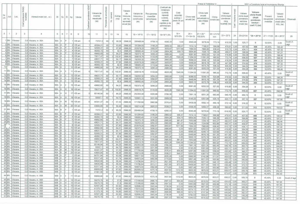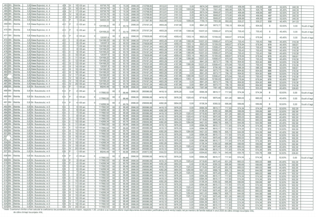 Primăria Bistrița precizează că valorile chiriilor actualizate au fost calculate la nivelul maxim al coeficientului de venit, respectiv 1,00, și vor putea fi modificate ulterior, doar după depunerea documentelor justificative privind venitul mediu net pe membru de familie realizat în anul 2019 de către chiriașii locuințelor ANL, cu aprobarea primarului municipiului Bistrița, începând cu luna următoare depunerii documentelor.
