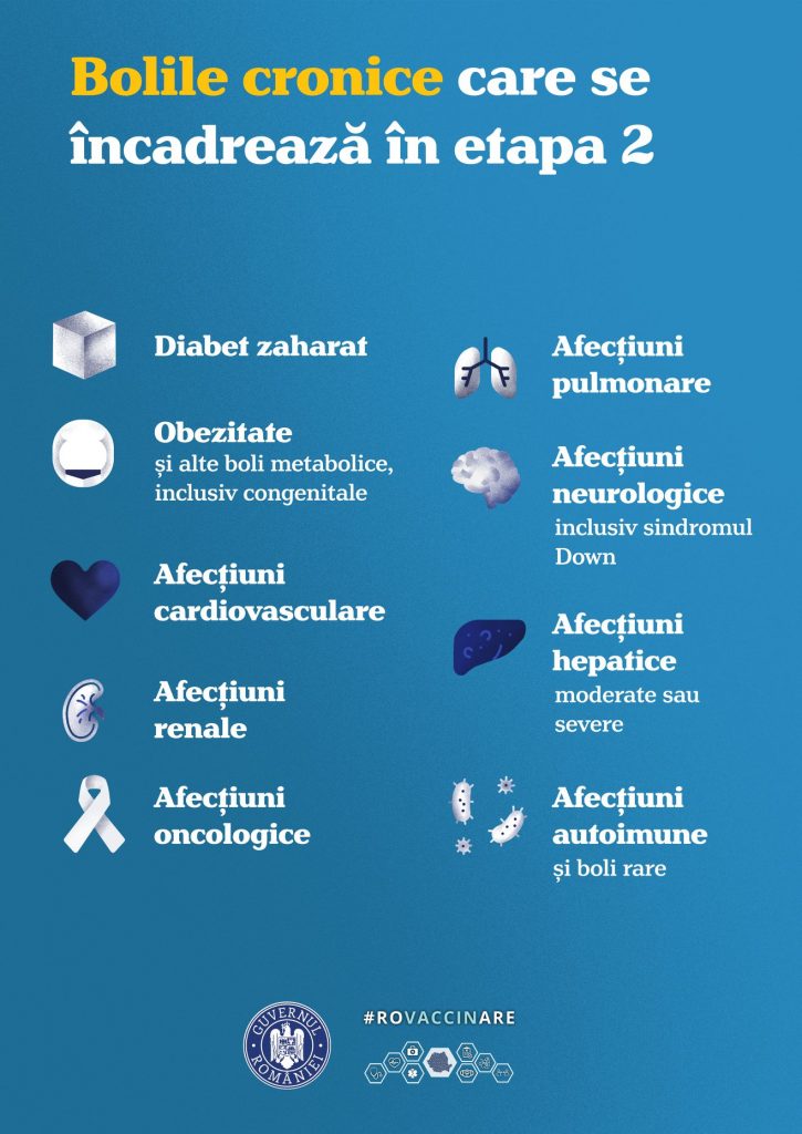 - Persoanele aflate în evidență cu boli cronice, indiferent de vârstă, în funcție de indicațiile vaccinurilor utilizate.