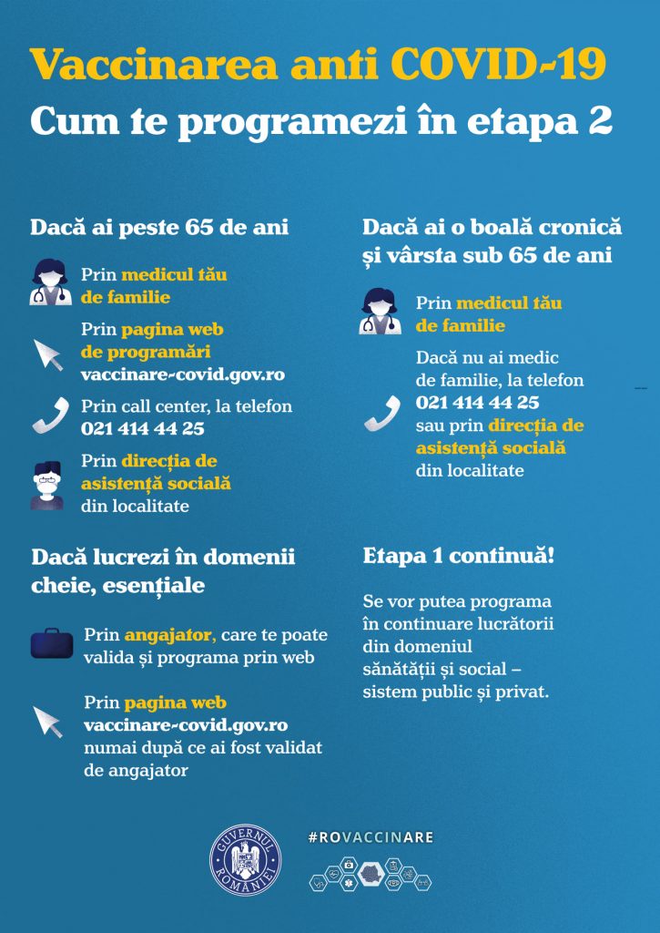 Centrele de vaccinare stabilite pentru etapa I de vaccinare (care vizează lucrătorii din sistemul medical și social) sunt în continuare funcționale pentru prima fază, care se derulează în paralel cu cea de-a doua etapă.