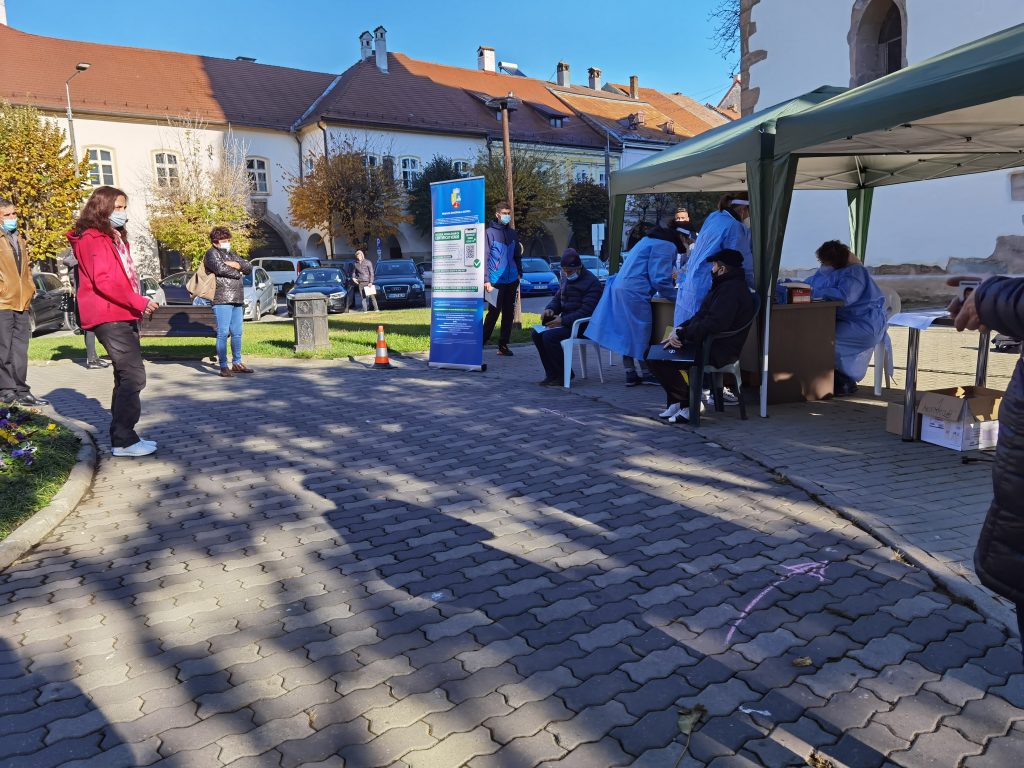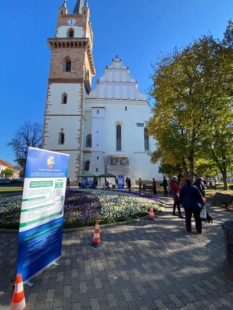 În fața Bisericii Evanghelice din Piața Centrală a fost amenajat un punct de testare, o echipă a Serviciului Voluntar pentru Situații de Urgență din cadrul Primăriei Bistrița ocupându-se de testarea persoanelor.