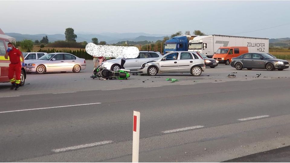 Două persoane au fost rănite în urma unui accident rutier produs pe DN 17 și în care au fost implicate un autoturism și o motocicletă.