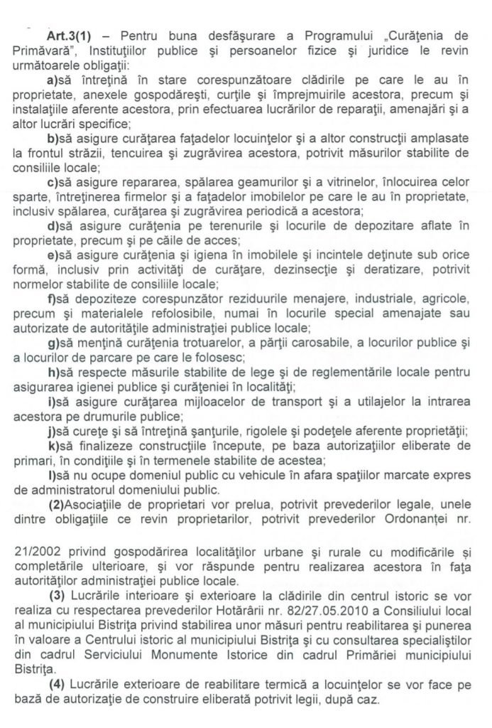 De asemenea, Primăria Bistrița amintește bistrițenilor că participarea la campania ”Curăţenia de primăvară” este o datorie civică a cetăţenilor, asociaţiilor de proprietari / locatari, agenţilor economici, instituţiilor şi autorităţilor publice care domiciliază, au sediul şi / sau îşi desfăşoară activitatea pe raza municipiului Bistriţa şi localităţile componente. Toate persoanele fizice și juridice din Bistrița au o serie de obligații: