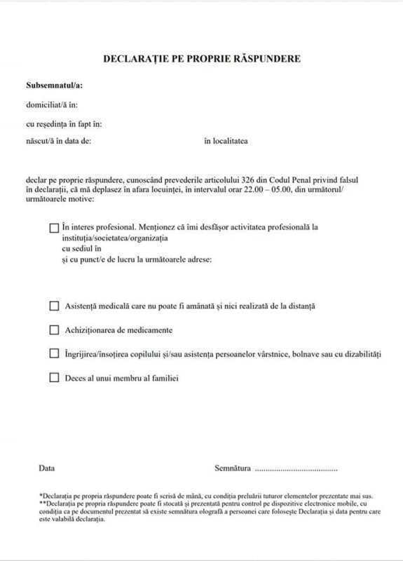 Ministerul Afacerilor Interne a publicat modelul declarației pe proprie răspundere necesară pentru circulația persoanelor în afara locuinței/gospodăriei, în intervalul orar 20.00 – 05.00, în localitățile în care incidența cumulată în ultimele 14 zile este mai mare de 4 la 1.000 de locuitori și mai mică de 7,5 la 1.000 de locuitori, pentru zilele de vineri, sâmbătă și duminică și pe întreaga durată a săptămânii, în localitățile în care incidența cumulată în ultimele 14 zile este mai mare de 7,5 la 1.000 de locuitori, precum și modelul adeverinței eliberate de angajator.