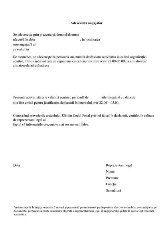 Declarația pe proprie răspundere completată/adeverința eliberată de angajator se va afla în posesia persoanei care efectuează deplasarea, împreună cu documentul de identitate, și va fi pusă la dispoziția reprezentanților Poliției Române și ai Jandarmeriei Române, la momentul legitimării persoanei.