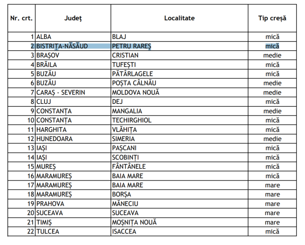 Astfel, în Baia Mare, Suceava, Moșnița Nouă, Borșa și Măneciu, va fi construită câte o creșă mare (pentru 100-110 copii). Localitățile Cristian, Mangalia, Simeria, Poșta Câlnău și Moldova Nouă vor beneficia de câte o creșă medie (fiecare cu o capacitate de 70 de locuri). Totodată, câte o creșă mică (pentru 40 de antepreșcolari) va fi finanțată în Blaj, Techirghiol, Dej, Vlăhița, Pașcani, Scobinți, Baia Mare, Fântânele, Isaccea, Petru Rareș, Tufești și Pătârlagele.