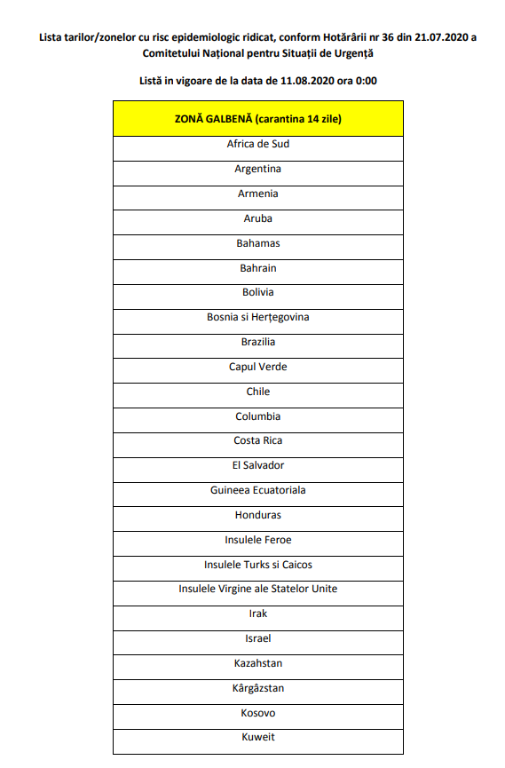 Noua listă care va intra în vigoare la data de 11 august, ora 00:00, cuprinde următoarele țări: