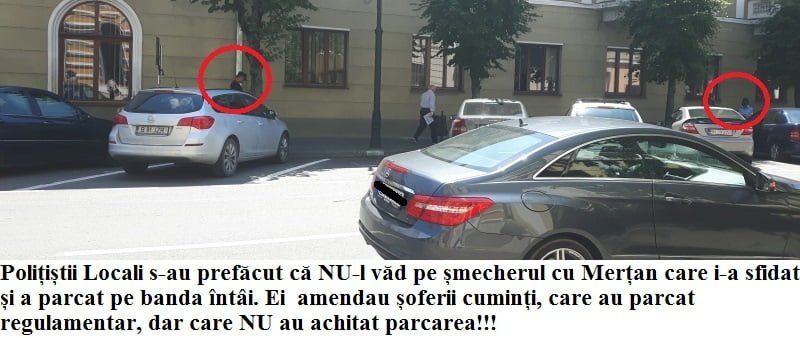 Situație absurdă a avut loc pe strada Gheorghe Șincai, unde sub nasul polițiștilor locali a parcat un șmecher cu Mercedes, care și-a lăsat mașina cu avariile puse, pe prima bandă și a intrat la farmacie! Asta în timp ce doi polițiști locali amendau șoferii parcați regulamentar, dar care NU au achitat taxa de staționare. După o staționare de aproximativ 1 minut, șoferul Mercedesului a demarat în trombă, de sub nasul polițiștilor locali, care NU s-au sinchisit nici măcar să-i fotografieze numărul de înmatriculare.