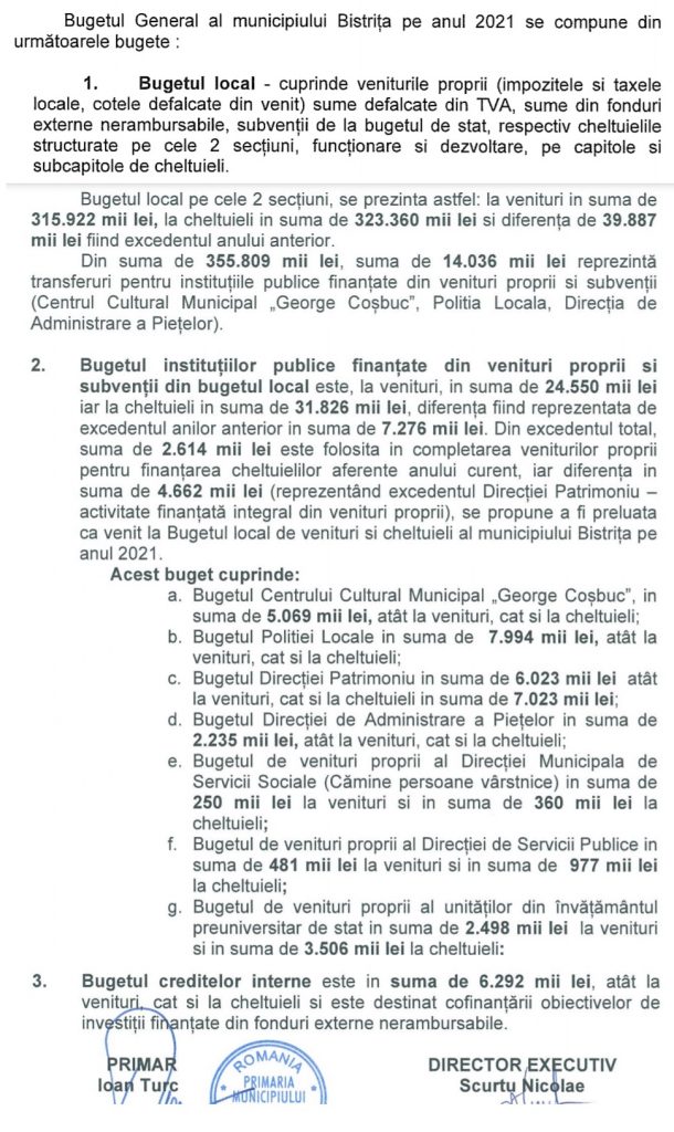 Primăria municipiului Bistriţa a întocmit proiectul de buget pe anul 2021. Potrivit informațiilor făcute publice de municipalitate, bugetul general de venituri și cheltuieli al municipiului se ridică la suma de 332 milioane lei (la capitolul venituri) și la aproximativ 380 milioane lei (la capitolul cheltuieli). Acesta este mai mare față de cel de anul trecut, când valorile erau de 330 milioane lei la capitolul venituri și 340 milioane lei la capitolul cheltuieli.