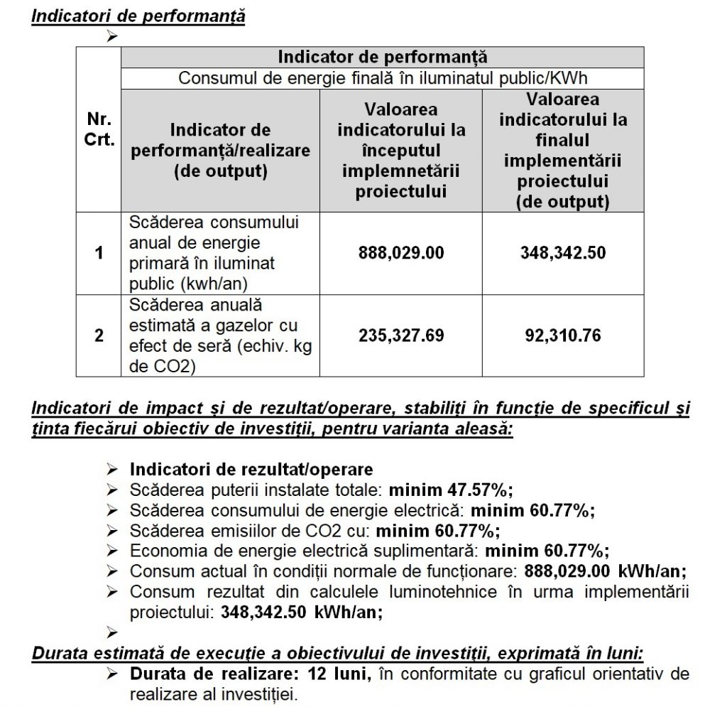 Potrivit administrației locale, prin implementarea investiției se va realiza o economie a consumului de energie electrică de minim 60,77%, față de situația actuală. Pentru a obține această economie, se vor monta corpuri de iluminat bazate pe tehnologie LED și se va implementa un sistem de telegestiune la nivelul întregului sistem de iluminat public vizat prin prezenta investiție.