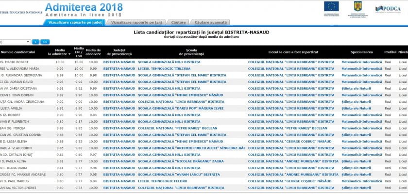 Pe site-ul edu.ro au fost postate rezultatele repartizării electronice și mediile cu care s-a intrat la liceu!La nivelul județului s-a înregistrat o singură medie de 10 la admiterea pentru liceu. Elevul care a obținut media maximă, Sima Mario Robert de la Școala Generală nr. 1 a optat pentru profilul mate-fizică la Colegiul Liviu Rebreanu.
