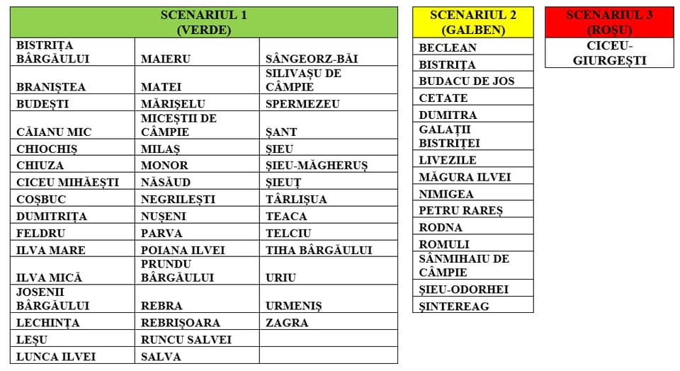 În ceea ce privește mediul urban, în orașele Năsăud și Sângeorz-Băi se aplică scenariul verde, în vreme ce în municipiul Bistrița și în orașul Beclean se aplică scenariul galben.