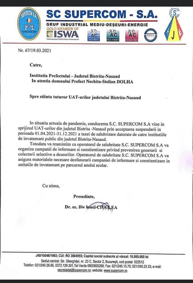 ”Preocupările pentru un mediu curat trebuie să depășească etapa bunelor intenții și a declarațiilor. Malurile râurilor copleșite de gunoaie, depozitele de gunoi aruncate la întâmplare, cantitatea mare de deșeuri neselectate sunt dovezi că mai avem foarte mult de lucru. Copiii noștri pot deveni însă aliați în această campanie pentru un mediu mai curat. Ei sunt primii care pot să-i învete pe adulți, pe parinții lor, bunici și rude, cât de important este să respecți mediul și natura. Salut decizia conducerii Supercom de a se implica în această campanie alaturi de școli și de primării, dar și de a renunța la taxa de salubritate a școlilor pentru o utilizare a acesteia direct în campanii”, a precizat prefectul Stelian Dolha.
