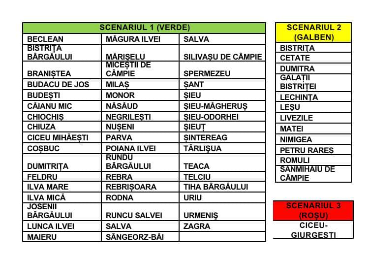În ceea ce privește mediul urban, în orașele Năsăud, Beclean și Sângeorz-Băi se aplică scenariul verde, în vreme ce în municipiul Bistrița se aplică scenariul galben.