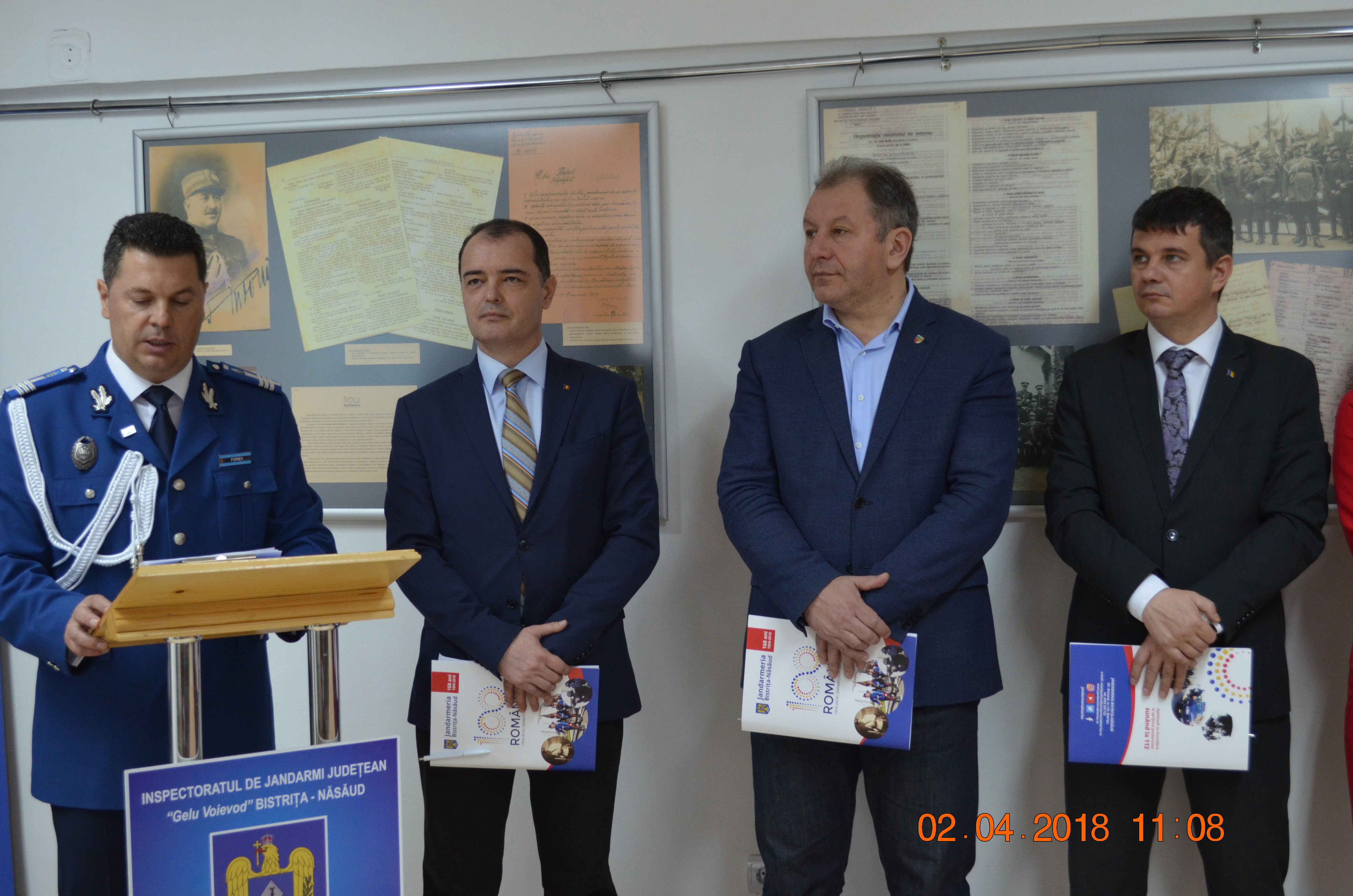 În 2 aprilie a avut loc vernisajul Expoziţiei Aniversare, intitulate sugestiv: 100 de ani de Jandarmerie în judeţul Bistriţa-Năsăud. Aceasta a fost organizată cu sprijinul Arhivelor Naţionale – Serviciul Judeţean Bistriţa-Năsăud, la sediul acestei instituţii, din strada Gării, nr. 3-5.