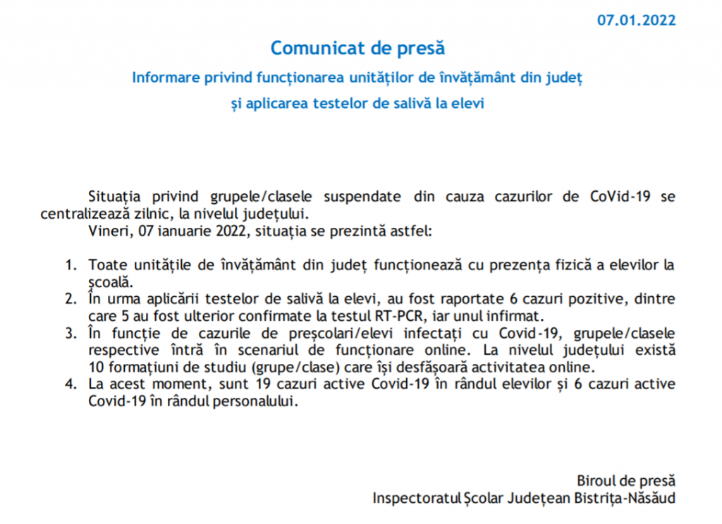 Totodată, IȘJ Bistrița-Năsăud precizează că șase elevi din judeţ au avut rezultate pozitive la testele rapide de salivă efectuate acasă, cinci dintre rezultate fiind confirmate și de analizele de laborator, prin testare RT-PCR, în vreme ce unul a fost infirmat.