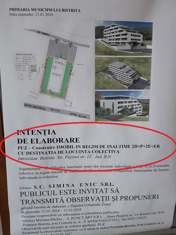 Potrivit proiectului, Florin Vasile Ponoran cu domiciliul în București, propune ”schimbarea destinaţiei terenului aflat în intravilan din L2 în L3 şi construirea a șase imobile cu regim de înălţime P(D)+3E”. În acest sens, modificările din Planul Urbanistic General pot fi realizate doar cu acordul Serviciului Urbanism din Primăria Bistrița (subordonat direct primarului). Momentan, conform Planului Urbanistic General aprobat acum câțiva ani, strada Ghinzii are un regim de înălțime limitat la construcții cu 2 etaje!
