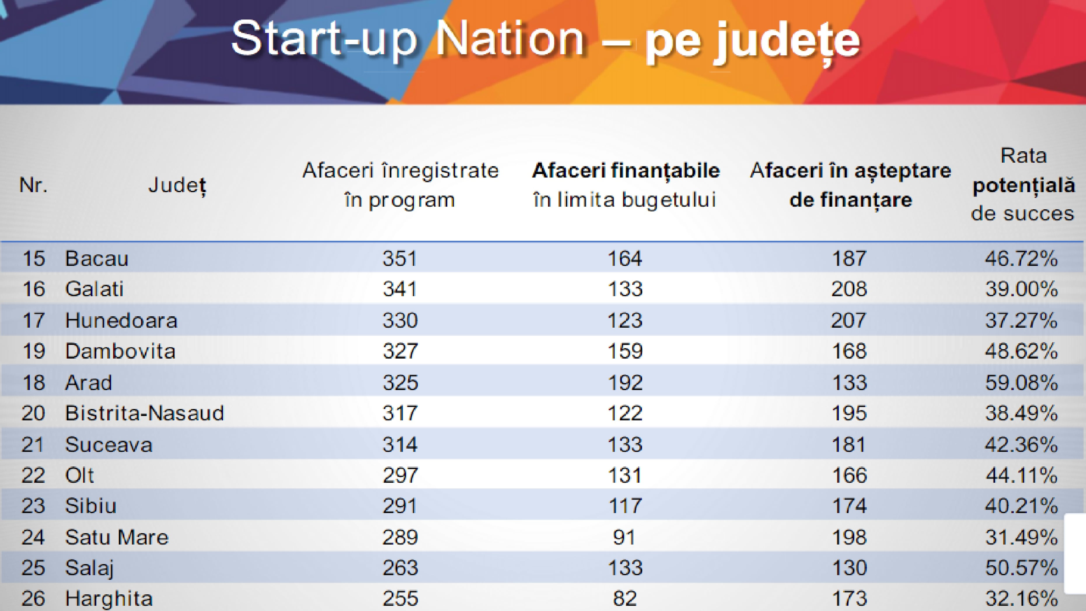 În ceea ce privește județul Bistrița-Năsăud, acesta se află pe locul 22 în clasamentul national, cu 317 solicitanți ai fondurilor nerembursabile care au depus proiecte. 122 dintre planurile de afaceri au reușit să obțină punctaje finanțabile, adică aproape 40 la sută.
