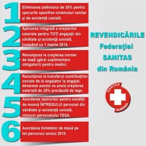 Sindicaliștii solicită eliminarea plafonului de 30% pentru acordarea sporurilor specifice care, dacă va fi aplicat, va duce la scăderea veniturilor actuale ale angajaților, acordarea sporurilor pentru condițiile de muncă întregului personal din sănătate și asistență socială, inclusiv personalului tehnic și administrativ. De asemenea, pe lista de revendicări se numără și aplicarea integrală a creșterilor salariale pentru toți angajații din sănătate și asistență socială, începând cu 1 martie 2018 și renunțarea la transferul contribuțiilor sociale de la angajator la angajat, câtă vreme aceasta se traduce, în sectorul public, prin anularea creșterii salariale de 25% prevăzută în lege. O altă revendicare este legată de acordarea tichetelor de masă pe tot parcursul anului 2018.