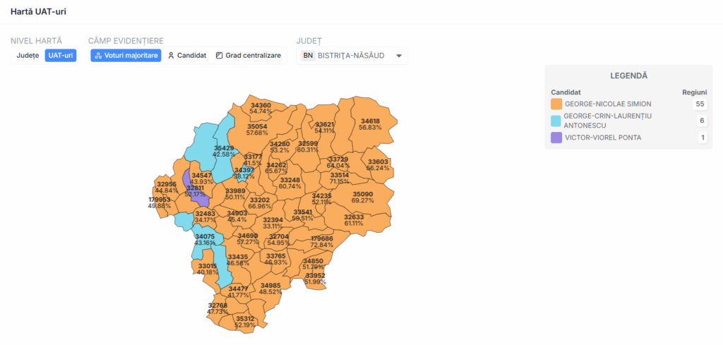 În primul tur al alegerilor prezidențiale, candidatul AUR, George Simion, s-a impus în 55 dintre cele 62 de unități administrativ-teritoriale din județul Bistrița-Năsăud.