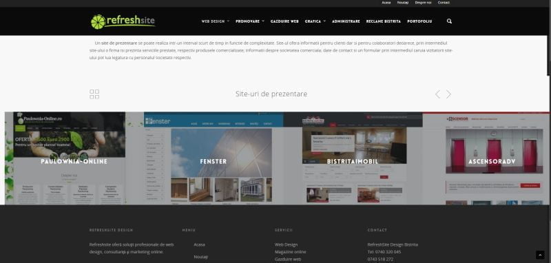 – Refresh Site Design din Bistrița – Refreshsite oferă soluţii profesionale de web design, consultanţă şi marketing online, realizare de site-uri, dezvoltare de magazin virtual, proiectare şi realizare de aplicaţii web şi portaluri tematice complexe, dezvoltare rețele sociale, mentenanţă, servicii complete de webhosting si suport tehnic pentru toate serviciile oferite: https://www.refreshsite.ro/portofoliu/