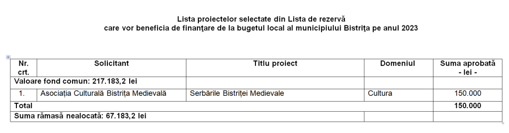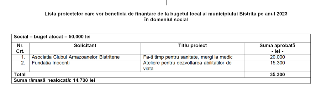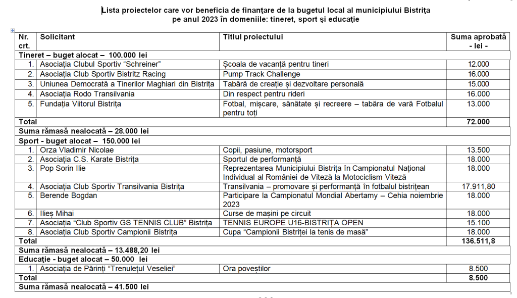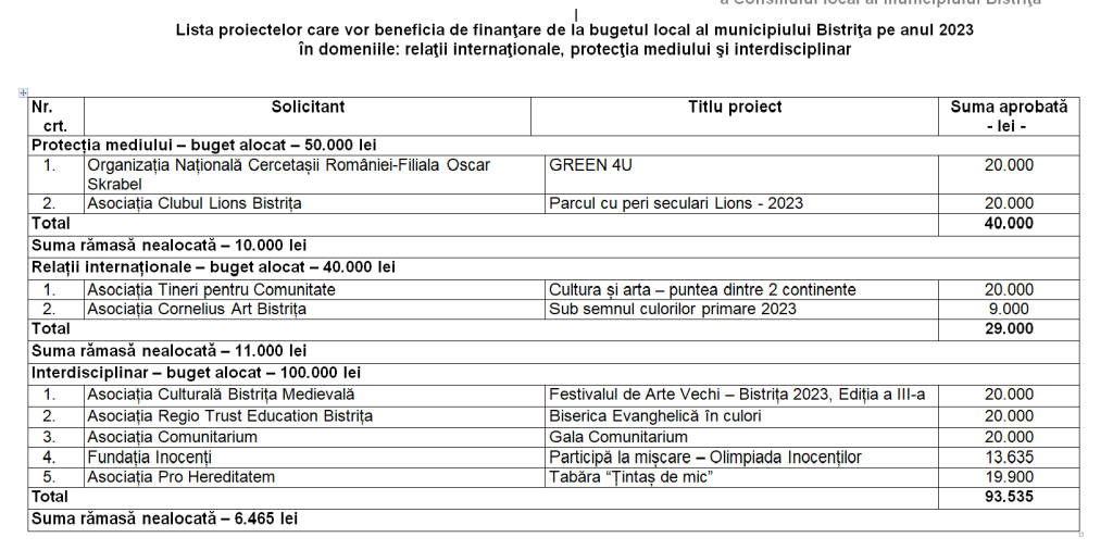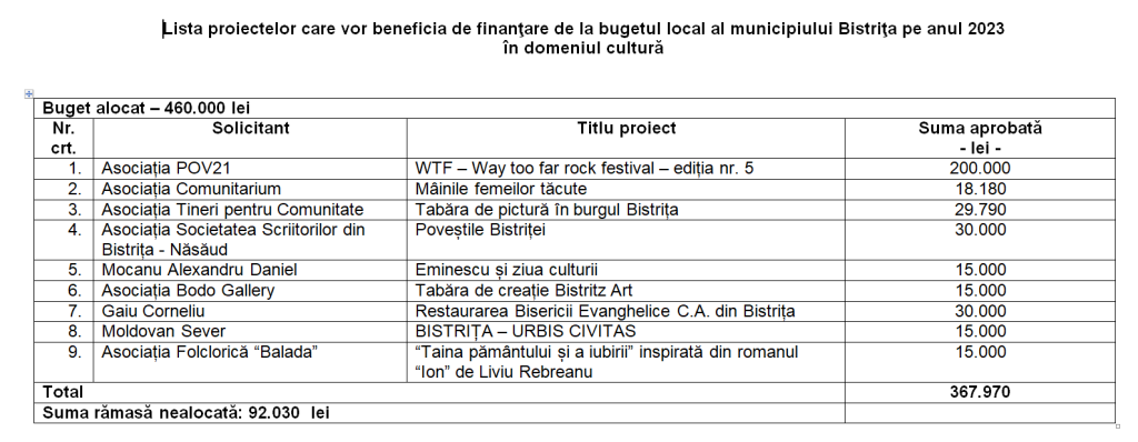 Proiectele care vor beneficia de finanţare de la bugetul local al municipiului Bistriţa pe anul 2023 sunt următoarele: