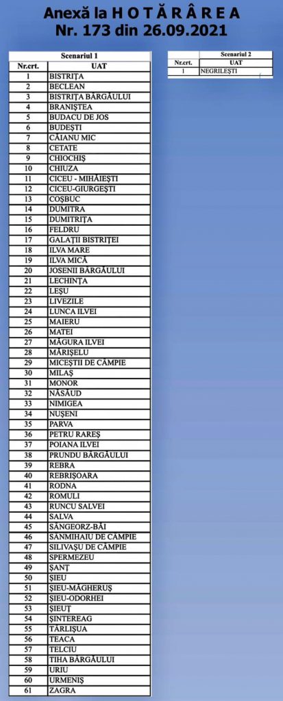 La nivelul județului Bistrița-Năsăud, la data de 27 septembrie, majoritatea unităților de învățământ funcționează în scenariul 1, care presupune participarea zilnică cu prezență fizică a tuturor antepreșcolarilor, preșcolarilor și elevilor în unitățile de învățământ, cu respectarea și aplicarea tuturor normelor de protecție