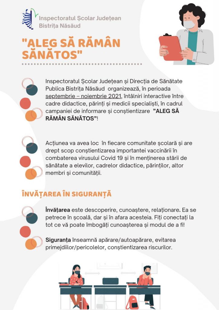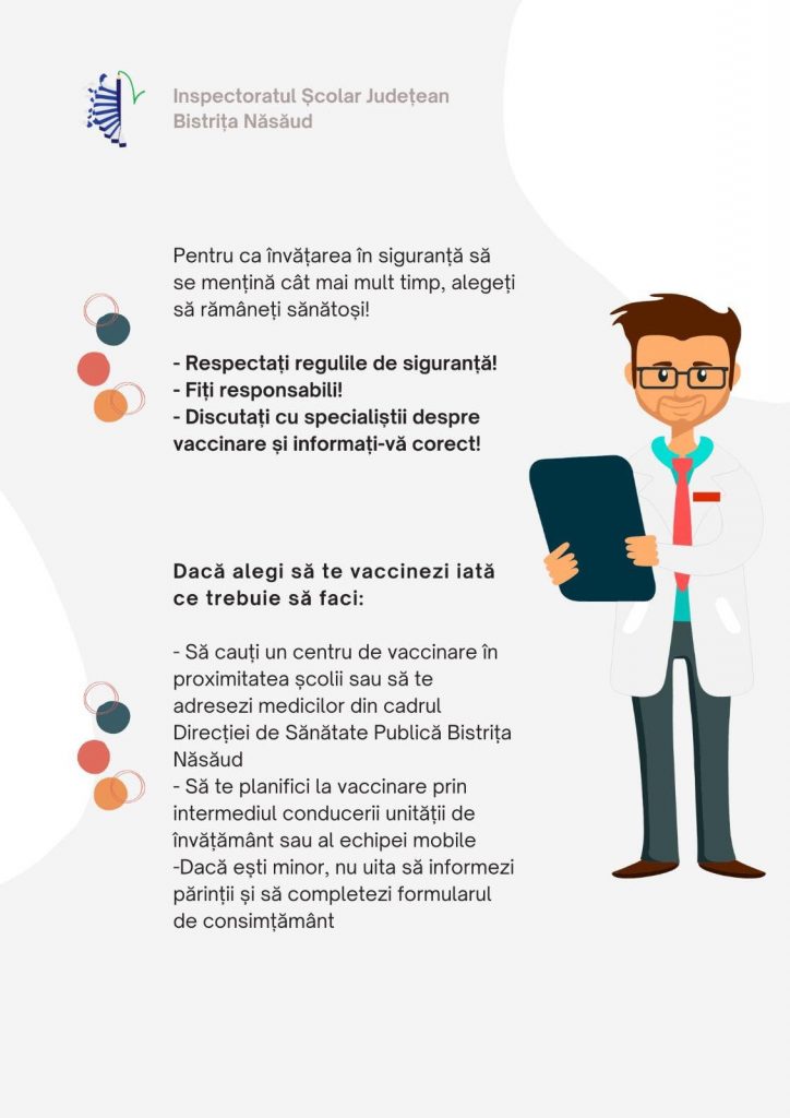 Potrivit IȘJ Bistrița-Năsăud, astfel de acțiuni vor avea loc în fiecare comunitate școlară și are drept scop conștientizarea importanței vaccinării în combaterea virusului COVID-19 și în menținerea stării de sănătate a elevilor, cadrelor didactice, părinților și altor membri ai comunității.