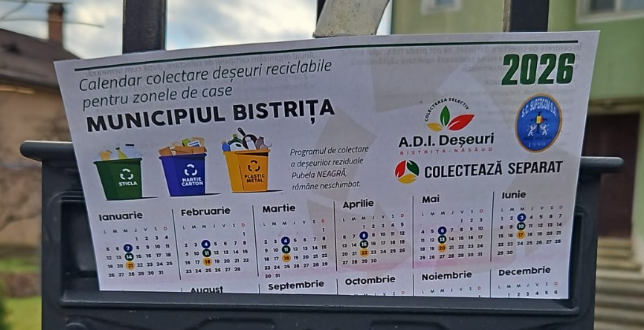 Asociația de Dezvoltare Intercomunitară (ADI) Deșeuri Bistrița-Năsăud a început să distribuie calendare cu programul de colectare a deșeurilor reciclabile pentru anul 2026, destinate tuturor localităților din județ. Primele calendare au ajuns deja în municipiul Bistrița, urmând ca, pe parcursul lunii decembrie 2025, acestea să fie distribuite și în restul județului.
