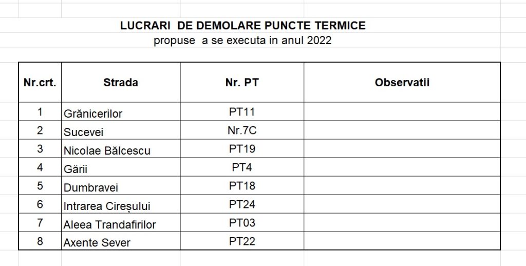 Demolarea a opt din cele zece foste puncte termice a fost deja prevăzută în planul de lucrări al Direcției de Servicii Publice pe anul 2022, iar pentru alte două municipalitatea va parcurge procedura legală în așa fel încât să poată să le demoleze și pe acestea.