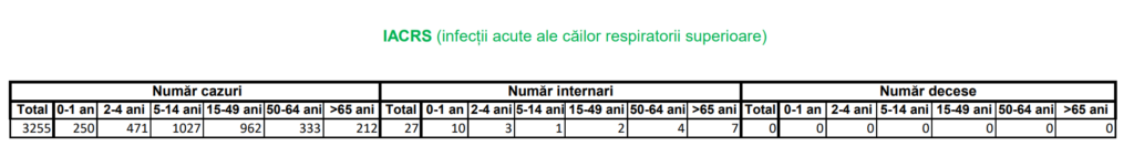 În ceea ce priveşte infecţiile acute ale căilor respiratorii superioare, au fost înregistrate în perioada amintită 3.255 de cazuri, din care 27 internate. Cele mai multe cazuri de IACRS au fost înregistrate la grupa de vârstă 5-14 ani (1.027), urmată de grupa 15 – 49 ani (962).