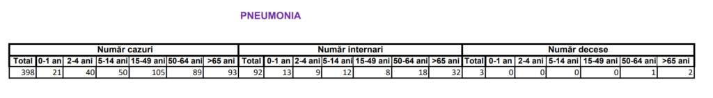 Totodată, s-au înregistrat și trei decese ale unor persoane care au fost diagnosticate cu pneumonie, fiind vorba despre două persoane cu vârste peste 65 de ani și o persoană din grupa de vârstă 50 – 64 de ani.