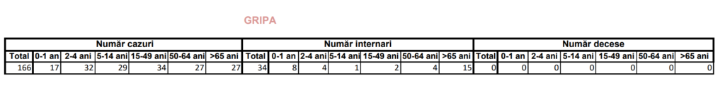 În intervalul menționat, în județ au fost raportate 166 de cazuri de gripă. Cele mai multe au fost înregistrate la grupa de vârstă 15 – 49 ani (34 de cazuri). Pentru că au făcut forme mai grave de boală, 34 de pacienți au avut nevoie de spitalizare.