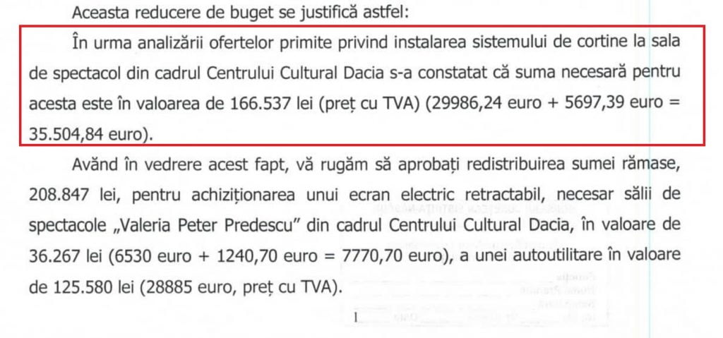 Centrul Județean pentru Cultură a solicitat achiziționarea unui sistem de cortine de ultimă generație, investiție supra-estimată la 100.000 de euro, dar surpriză: la licitație, valoarea a scăzut la jumătate și astfel s-au realizat economii de peste 45.000 de euro. Banii rămași sunt solicitați însă pentru alte investiții discutabile: 30.000 de euro pentru o autoutilitară, 10.000 de euro pentru o excursie în Besancon și 8.000 de euro pentru un ecran retractabil.