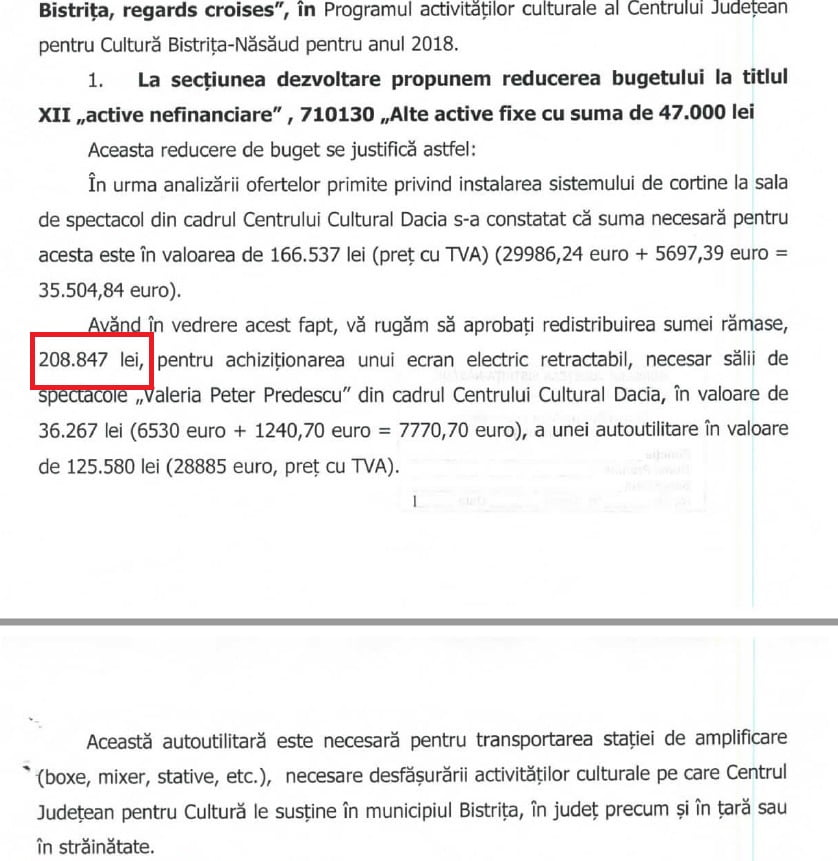 „Această utilitară este necesară pentru transportarea stației de amplificare, boxer, mixer, stative, necesare desfășurării activității Centrului Județean pentru Cultură, în municipiul Bistrița, în județ dar și în străinătate.