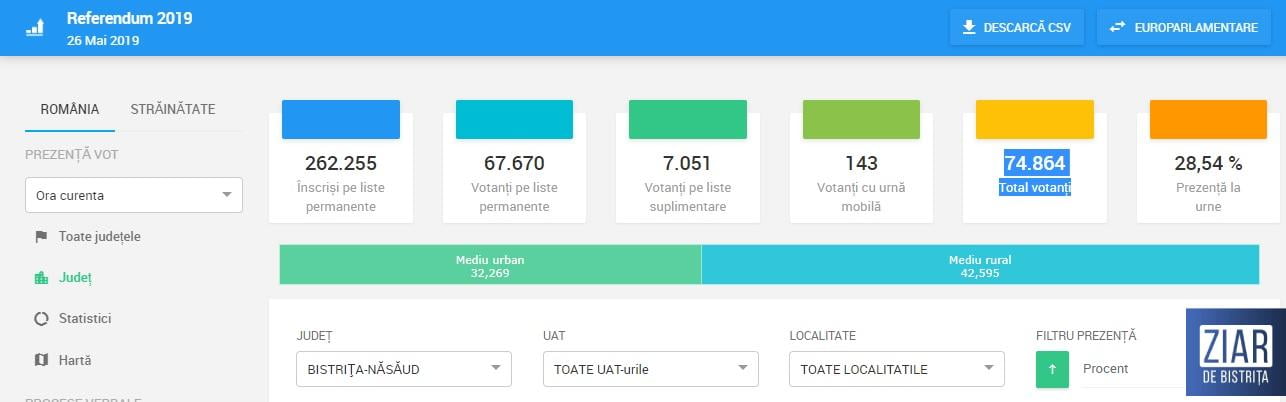 În ceea ce privește prezența la vot pentru referendumul național inițiat de Președintele Klaus Iohannis, aceasta era la ora 16:00, cu aproape 10 procente mai mică decât cea de la alegerile europarlamentare, respectiv de 28,54 la sută. Pentru referendum au votat 74.864 de bistrițeni.