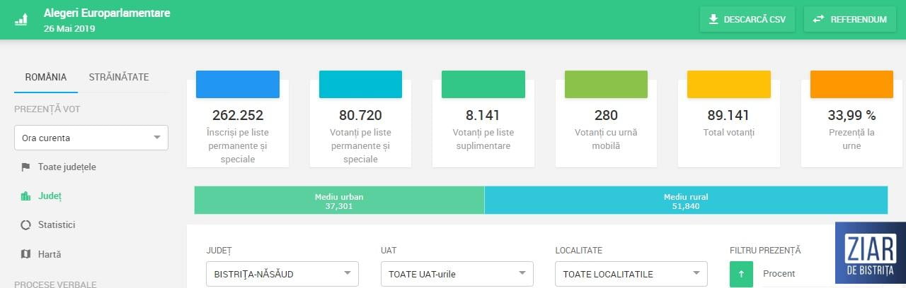 La ora 16:00, prezența la vot pentru alegerile europarlamentare în județul Bistrița-Năsăud era de 33,99 la sută, 89.141 de votanți prezentându-se la urne. Peste 8.000 de alegători au votat pe listele suplimentare și circa 300 cu ajutorul urnei mobile.