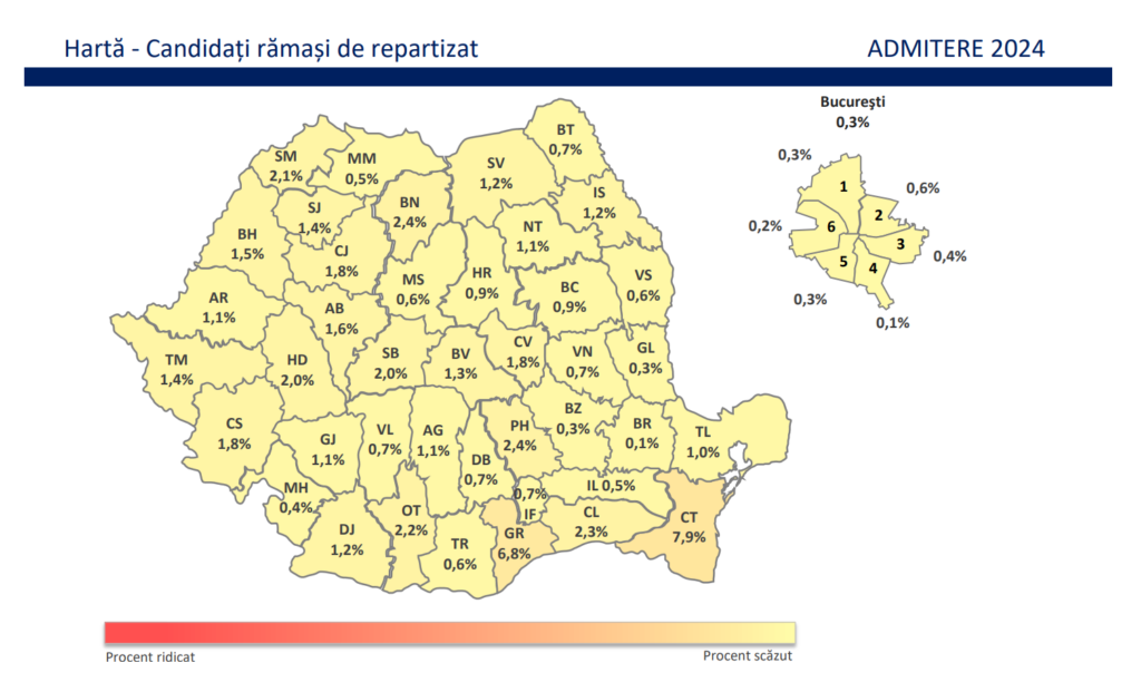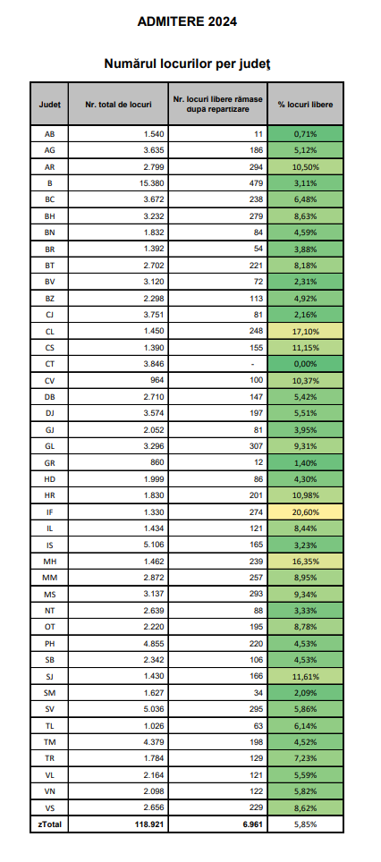 Numărul total de locuri în Bistrița-Năsăud a fost de 1.832, iar după repartizare au rămas 84 de locuri libere (4,59%).