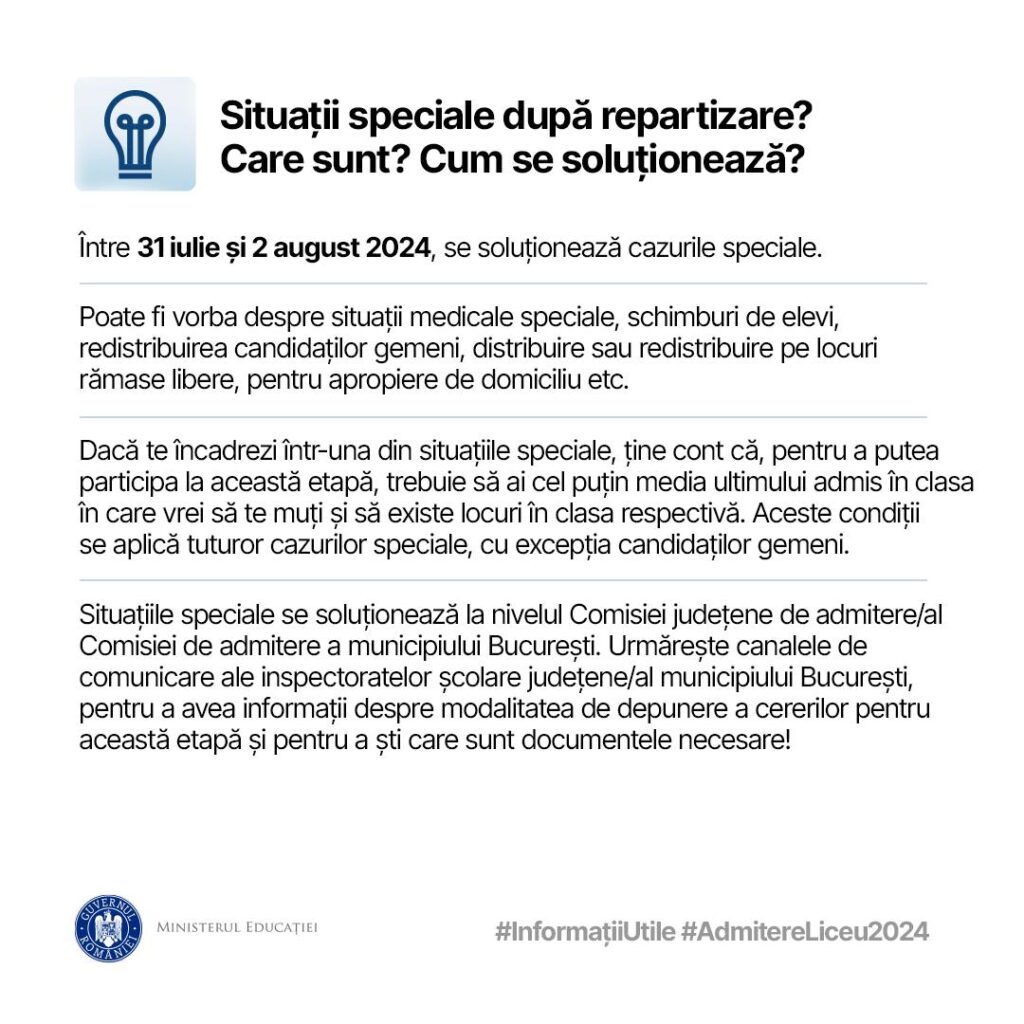 În intervalul 31 iulie – 2 august, comisiile judeţene de admitere/comisia ISMB vor soluţiona situaţiile speciale apărute după etapa de repartizare computerizată (situaţii medicale speciale, schimburi de elevi, redistribuirea candidaţilor gemeni, distribuire sau redistribuire pe locuri rămase libere, pentru apropiere de domiciliu etc.).